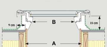 LuXtra Kuppeln werden als Aussparungsmaß (A) in cm angegeben. Das Netto-Glasmaß (B) einer LuXtra Kuppel ist immer 16,5 cm kleiner als das Aussparungsmaß (A).