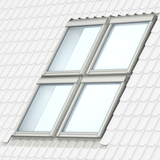 Vier identische VELUX Dachfenster mit einem Kombi-Eindeckrahmen EKW .. 2021M, EKW .. 2004ME und EKW .. 2006ME.