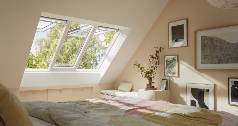 Drei VELUX Schwingfenster in einem Blendrahmen für mehr Tageslicht, eine bessere Aussicht und eine einfachere Installation. Die beiden äußeren Flügel lassen sich mit den Griffen an der Unterseite des Blendrahmens öffnen und bedienen. Die Klappkonstruktion gewährleistet einen ungehinderten Blick nach draußen. Der GPLS ist mit Lüftungsstäben ausgestattet, damit bei geschlossenem Fenster frische Luft in Ihre Wohnung gelangen kann.
